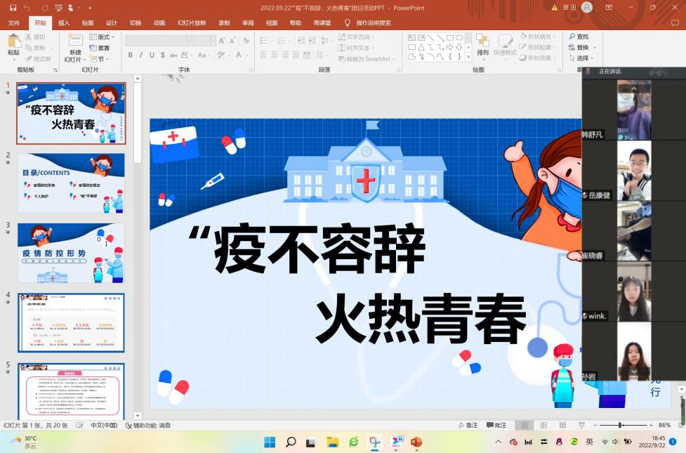 为进一步贯彻落实习近平总书记关于疫情防控的重要指示,做好疫情防控期间的思想教育,巩固阶段性抗击疫情成果,引导团员青年强化责任担当。9月22日,儒商学院于线上举办“‘疫’不容辞,火热青春”主题团日活动,2021、2022 级全体同学参加。