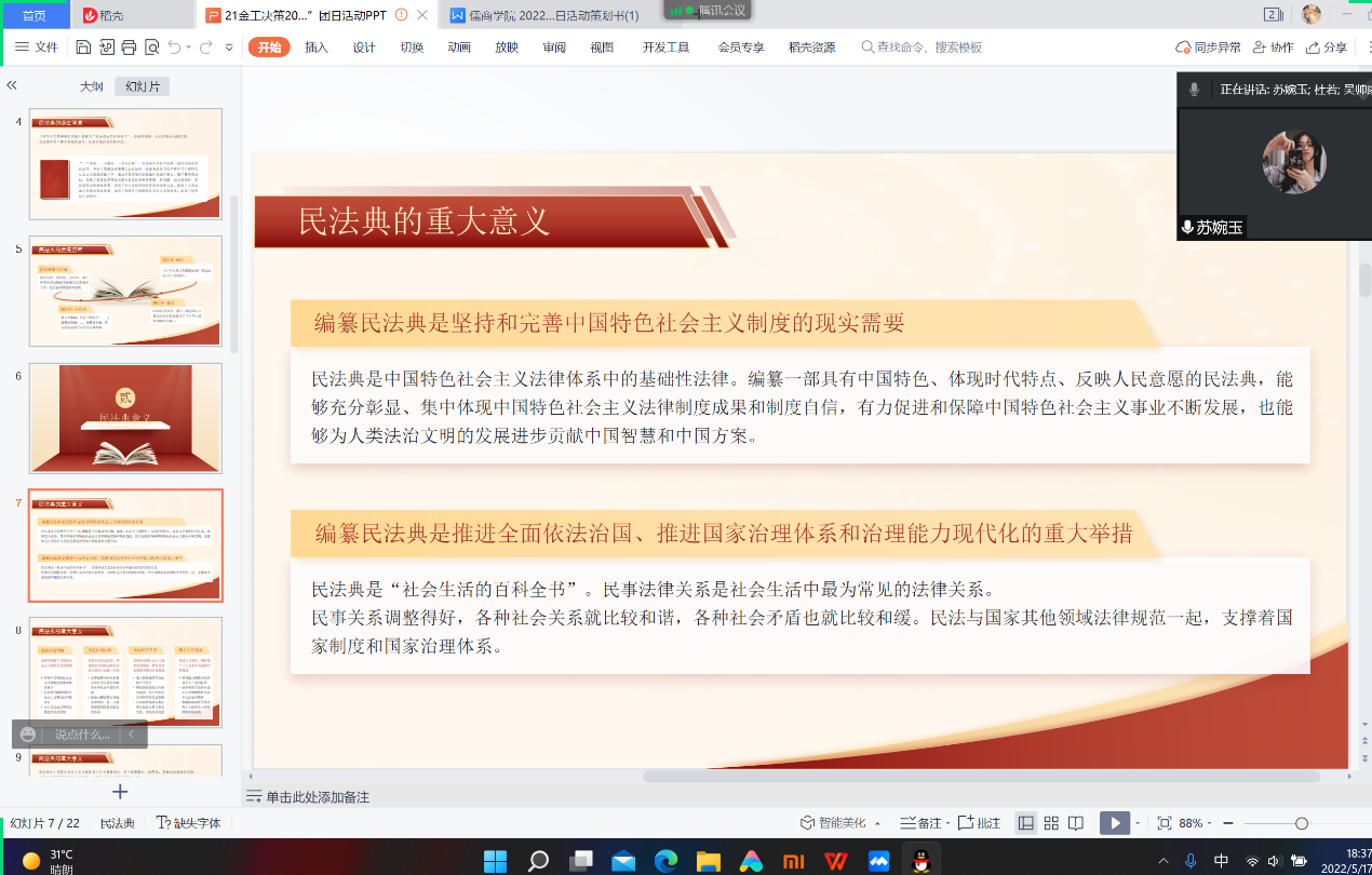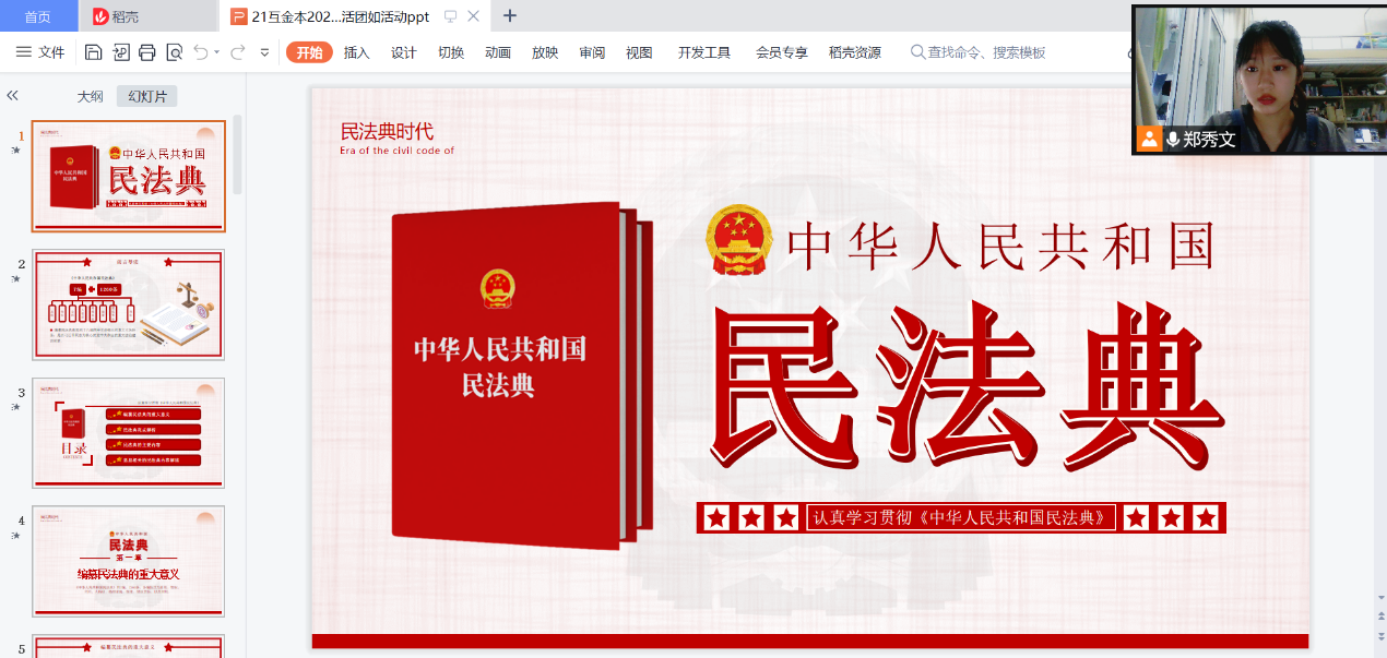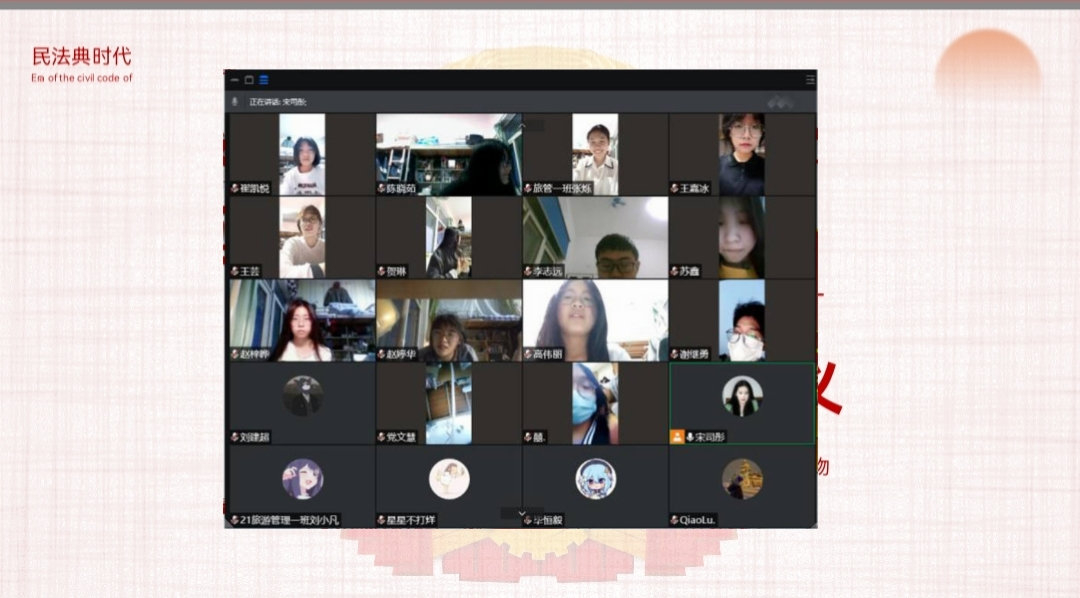 为深入学习贯彻习近平总书记关于加强民法典学习宣传的重要指示精神,帮助引导团员青年提高法律意识、培养法治思维,增强遵法、守法、学法、用法自觉性和主动性,儒商学院开展“学习《民法典》,守护美好生活”主题团日活动,2021级全体同学参加。