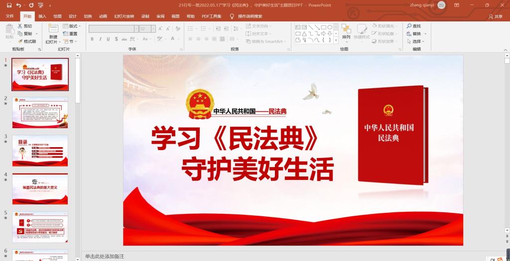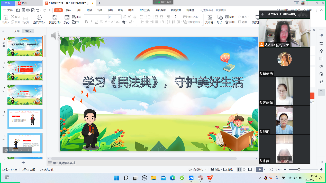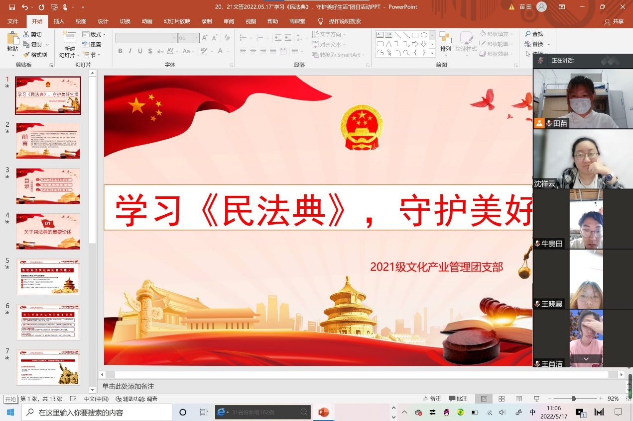 首先各支部团支书带领同学们系统学习《民法典》的相关知识,使同学们了解了民法典立法进程、民法典组成部分、民法典出台的重大意义及特征等方面内容,同时结合身边发生的典型案例,让大家感受到民法典就在身边,引导大家做遵纪守法的青年。最后同学们自由讨论畅所欲言,讲述自己的心得与体会,互相进行解惑,传递国家的法治制度观念。