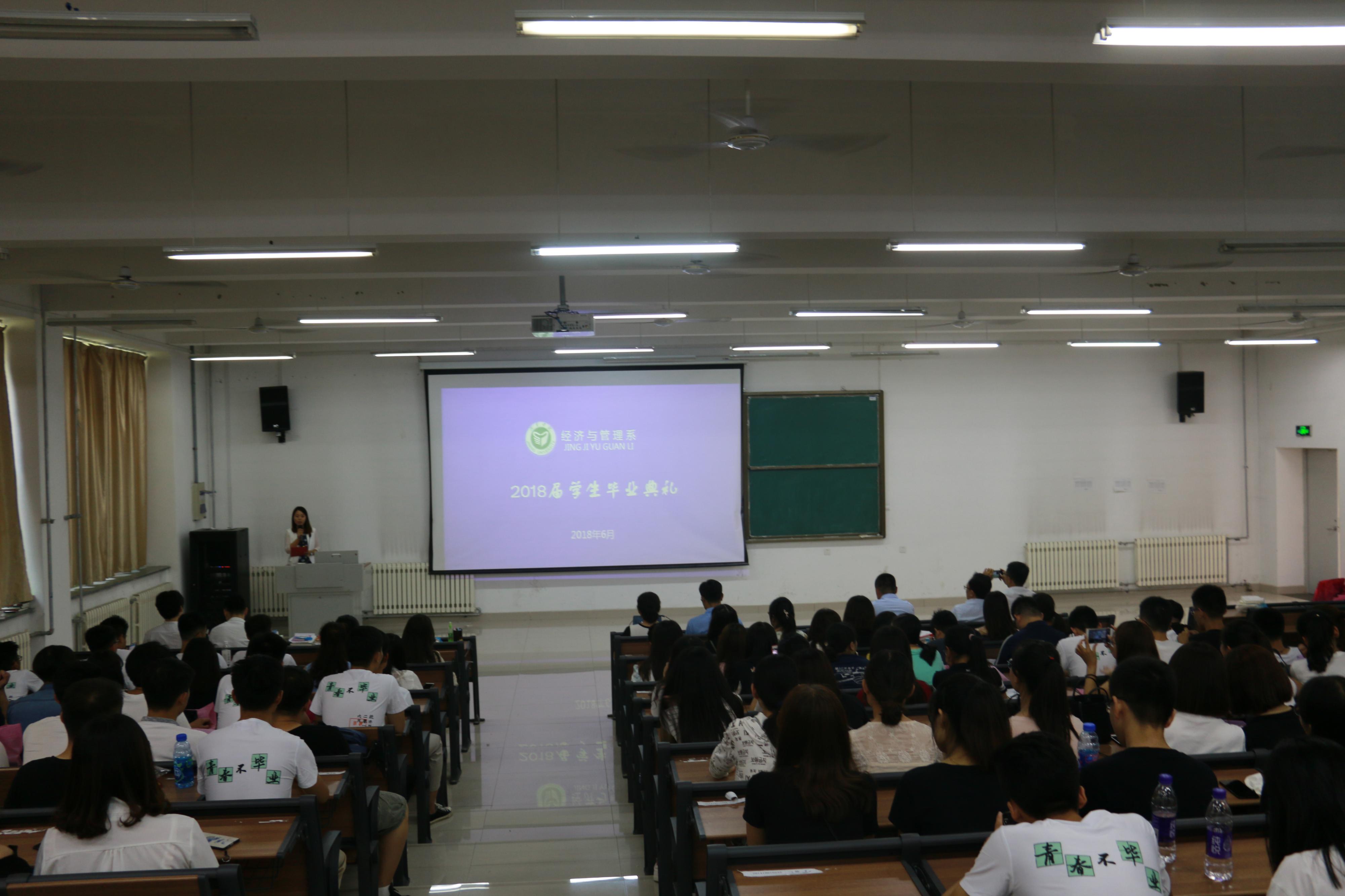 毕业典礼在雄壮的国歌声中拉开了帷幕。齐慧丽主任代表全系师生致辞,向即将告别母校,踏上新的人生征程的2018届毕业生表达了由衷的祝福,向大家提出坚守理想、锐意创新、开拓进取的殷切期望。接着,齐慧丽主任宣读了学士学位授予决定,80名同学获得管理学学士学位,183名同学获得经济学学士学位。由教师代表为本科毕业生授以“拨穗礼”,并颁发学士学位证书,为专科毕业生颁发毕业证书。闫晓晓、张振两位老师作为辅导员代表发言,字里行间流露出对毕业生同学的关心与期望,希望每位即将踏出校门的学子牢记母校的培养之恩,铭记老师的教导之情,为社会多做贡献,成为母校的骄傲,学院的自豪。臧俊、汪其瑞两位同学作为毕业生代表发言,他们回忆美好校园生活,道出了同学们对母校、对老师、对同伴浓浓的不舍之情,他们分享个人成长经历,勉励学弟学妹努力学习。王亮、徐远健两位同学作为在校生代表发言,表示会以学长学姐为榜样,好好规划自己的大学生活,不断迎接新的挑战。