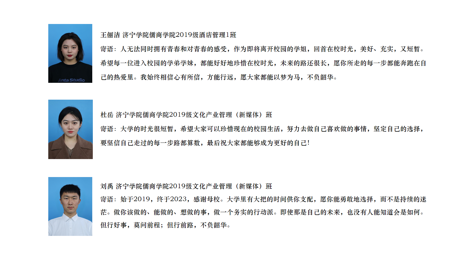 青春是石,敲出星星之火;梦想是火,点燃暗夜的灯;努力是灯,照亮独行的路;勤奋是路,引你走向黎明。风雨兼程,于畏途之中顾盼英武身姿;勇敢追梦,于学海之中见证弄潮英雄。精进不休、品学兼优是他们,但求奉献、不求流芳是他们,初心依旧、拼搏进取也是他们,他们几年如一日,用赤子之心谱写着青春诗篇,在最美的年岁里恣意绽放。下面就让我们一起走进他们——儒商学院2023年省优秀毕业生,走进他们限定的青春!