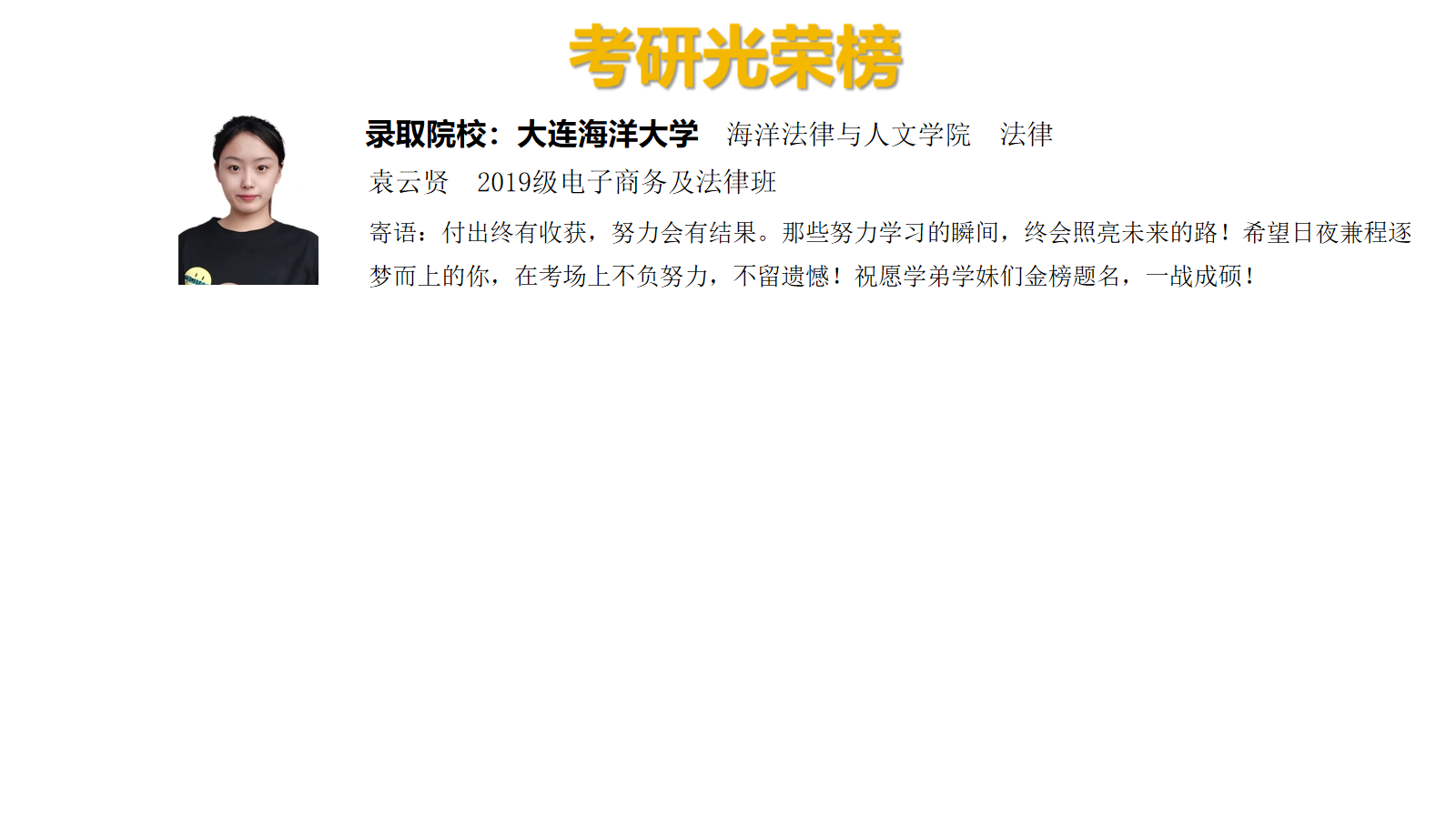 看过晚上十二点的玲珑夜景,见过早上四五点的人间黎明,从决定考研那一刻起,他们日日行,不怕千里万里;时时做,不惧千难万难。他们走了很远的路,路上有过失败,有过徘徊,但此刻他们收到了心仪学校的录取通知,一切付出和孤独都值得。下面就让小儒为大家公布儒商学院考研光荣榜,一起看看成功上岸的学长学姐们的考研之路!