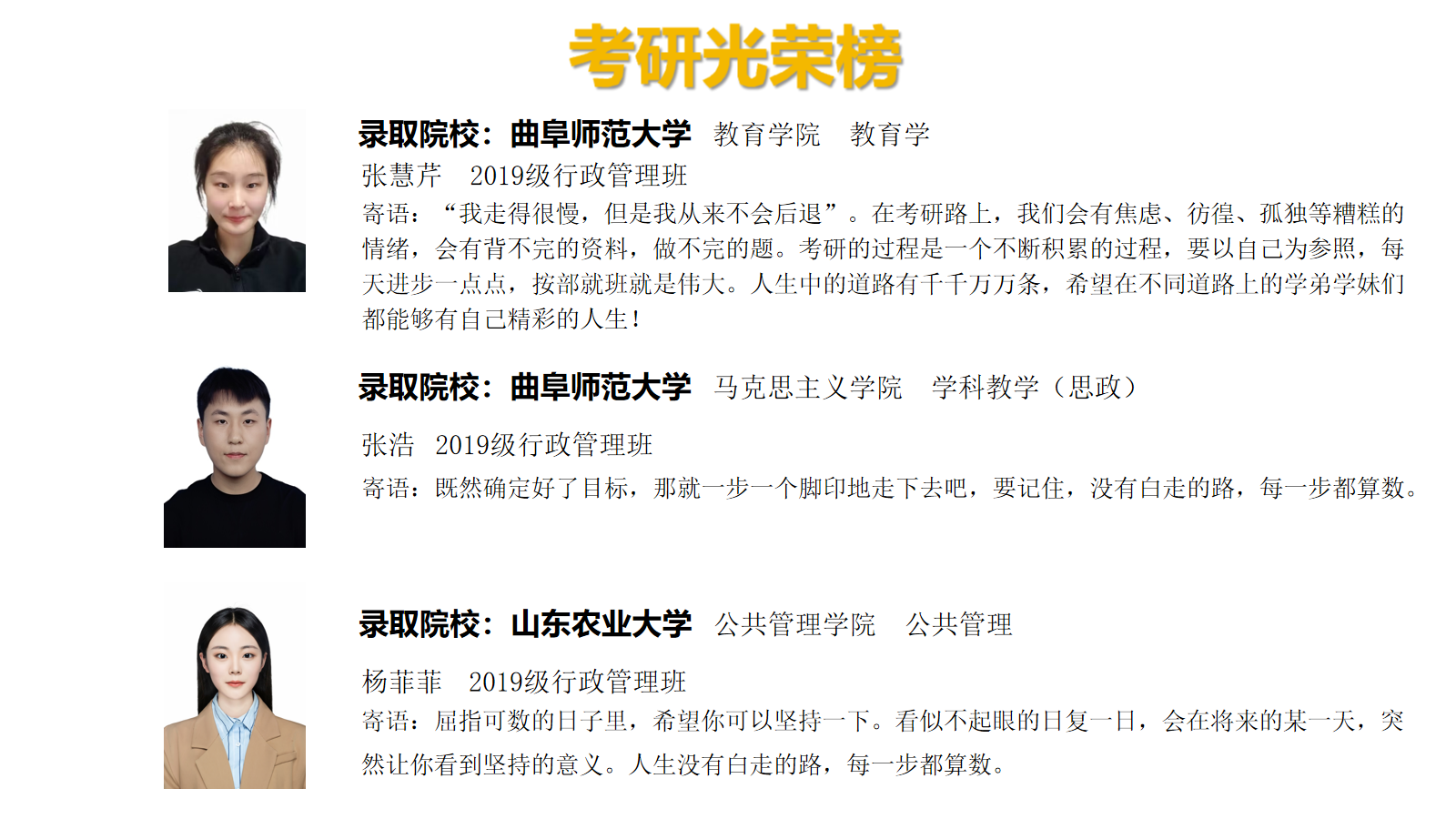 看过晚上十二点的玲珑夜景,见过早上四五点的人间黎明,从决定考研那一刻起,他们日日行,不怕千里万里;时时做,不惧千难万难。他们走了很远的路,路上有过失败,有过徘徊,但此刻他们收到了心仪学校的录取通知,一切付出和孤独都值得。下面就让小儒为大家公布儒商学院考研光荣榜,一起看看成功上岸的学长学姐们的考研之路!
