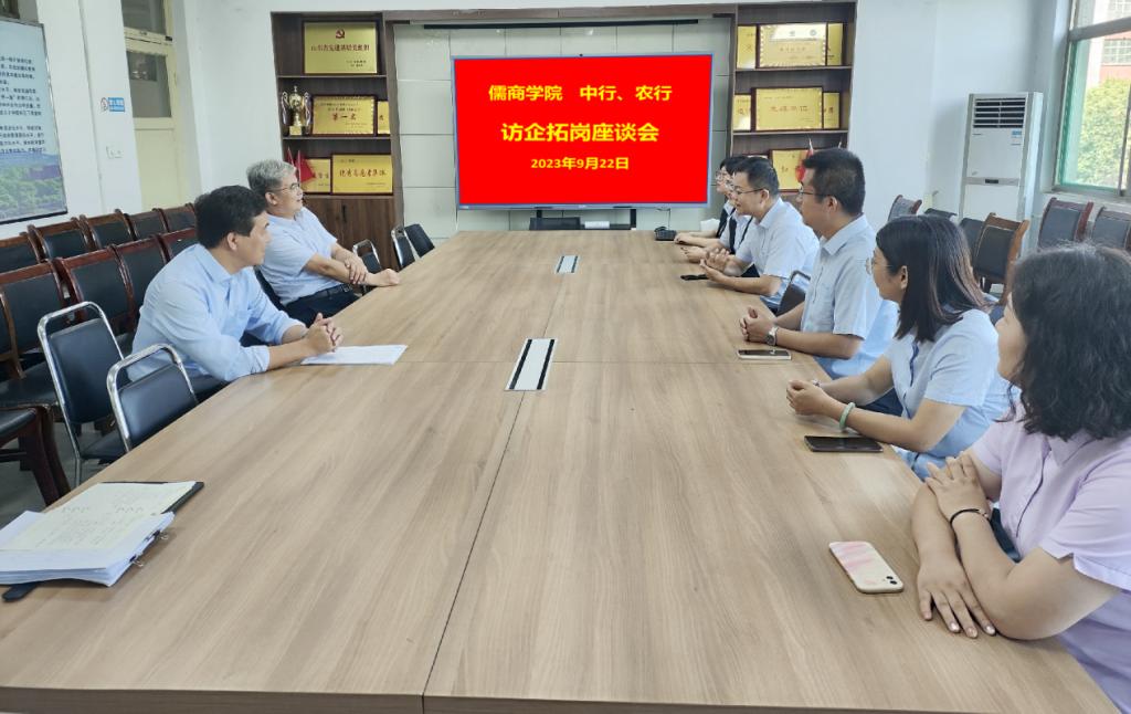为搭建国企银行和学生的双选平台,给学生提供良好的就业渠道,9月22日上午,儒商学院在学院会议室召开访企拓岗——中行、农行“引进来”座谈会招聘宣讲会。中国银行济宁市分行人力资源部邢翠部长一行、中国农业银行济宁市分行人力资源部李建功部长一行来我院对接2023年秋季招聘工作,儒商学院党委书记乔东华、分管就业工作的党委副书记孔国良参加了此次座谈会。