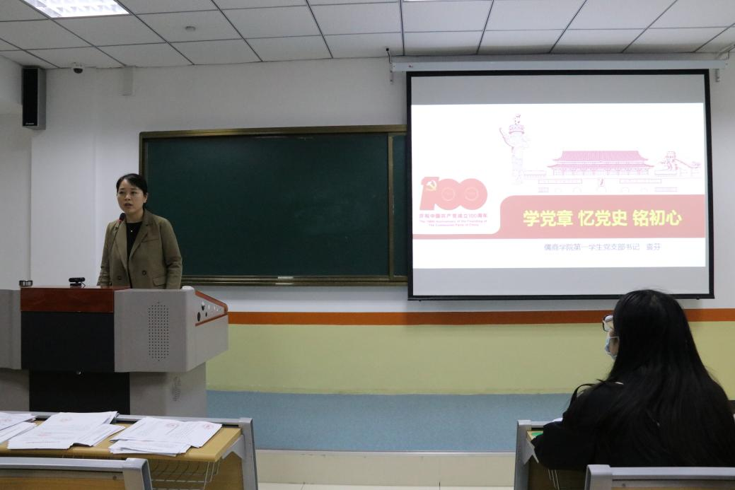 10月28日晚,儒商学院在3B306举办“学党章、忆党史、铭初心”主题党课活动,该院第一学生党支部书记袁芬为第二十八期发展对象上党课。