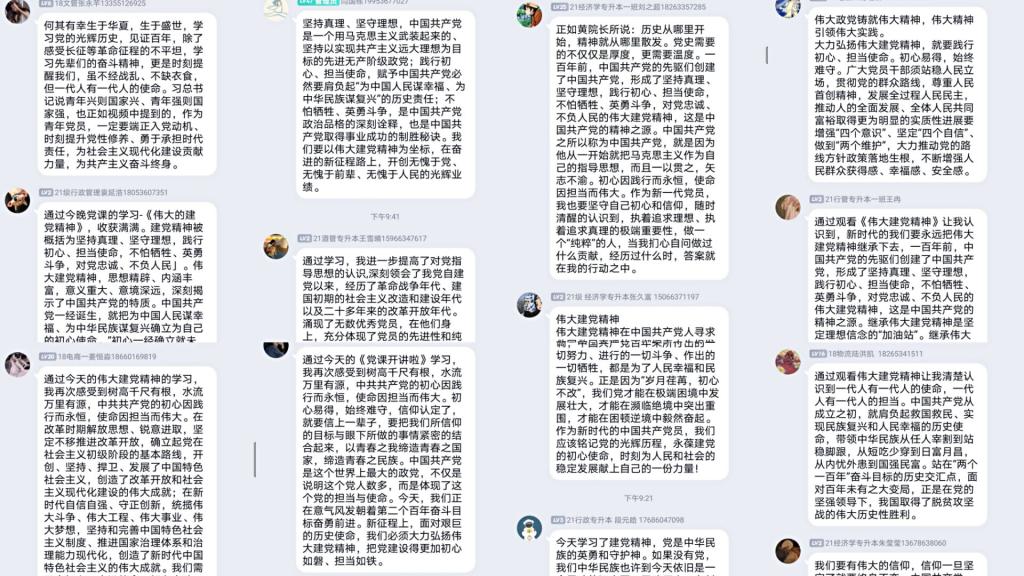 历史川流不息,精神代代相传。观看节目后,党员同志们在支部群中开展交流研讨,讨论现场气氛热烈,大家纷纷表示通过这一期的党课学习,加深了对建党精神的理解,继续以习近平新时代中国特色社会主义思想为指引,深刻把握伟大建党精神的内涵要义,充分认知“四句话、三十二个字”的建党精神。站在“两个一百年”奋斗目标的历史交汇点上,作为新世纪的党员,要坚定自己的信念,坚持真理、坚守理想,学习、感悟、传承和弘扬伟大建党精神,从中汲取源源不断的奋斗力量,无惧风险的革命精神,不忘初心,牢记使命!