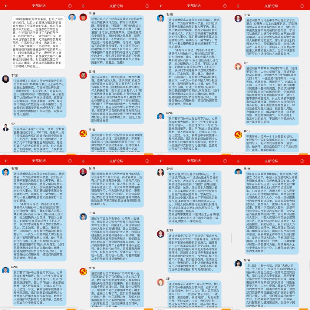 大会深刻总结孙中山先生和辛亥革命先驱为中华民族建立的历史功绩,动员呼吁海内外全体中华儿女更加紧密地团结起来,携手向着中华民族伟大复兴的目标继续奋勇前进。“惟愿诸君将振兴中华之责任,置之于自身之肩上。”观看讲话之后,党员同志们在“灯塔-党建在线”支部论坛中踊跃发表感悟,纷纷表示要牢记习近平总书记的要求和期望,继承和发扬孙中山先生和辛亥革命先烈的爱国主义精神,继续脚踏实地、团结奋斗,以青春之热血、昂扬之姿态,不断把中华民族伟大复兴的历史伟业推向前进。