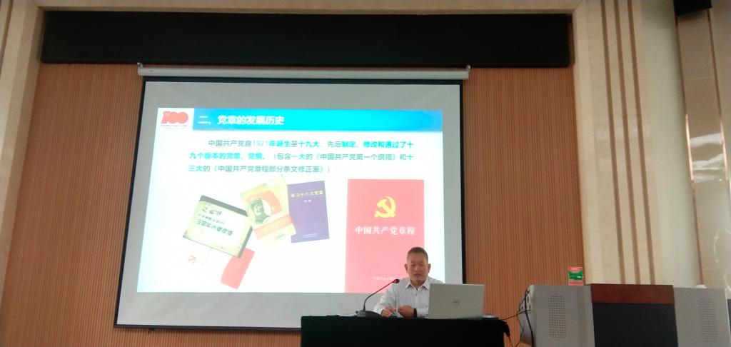 下午,马克思主义学院书记樊海涛同志主讲以"认真学习党章,坚定理想信念"为主题的报告。樊书记针对党章的发展历史以及十九大党章的重要内容等几个方面对党章进行了详细讲解,让学员们进一步了解关于立党治党管党的各项规定,也在学习中更加深刻把握习近平新时代中国特色社会主义思想,在学思践悟中规范自我,以实际行动践行一名共产党员的初心与担当。