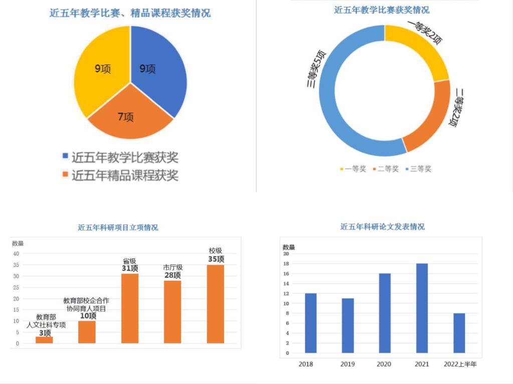 教学改革方面,互联网金融专业采用案例分析法、研讨式教学法和合作式教学法,金融工程教研室采用以赛代练、以赛促学教学模式,有效提升了教学效果。校企合作方面,实行“共建共管”及“校内-校外双导师制”,共同构建“三实”教学模式,强化学生应用能力培养;实施“121”工程培养模式,模块化教学、SPOC混合教学,课程应用性更加贴近企业用人需求。教学成果显著,获省级微课比赛二等奖1项、三等奖1项,校级青年教师讲课比赛一等奖2项、三等奖2项,校级说课比赛二等奖3项。科研成果丰硕,获得教育部人文社科专项3项,教育部校企合作协同育人项目10项,省级科研项目31项,市厅级科研项目28项,校级科研项目35项;发表论文64篇;出版专著4部;32项成果获市厅级奖励,34项成果获校级奖励。