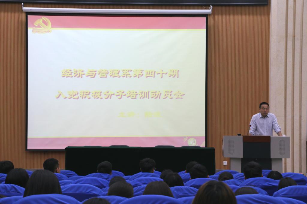 5月6日经济与管理系第四十期入党积极分子培训正式开班。晚七点,经济与管理系于3号楼报告厅开展入党积极分子动员大会,本次培训由经济与管理系党总支书记陆波主讲,全体入党积极分子参加。