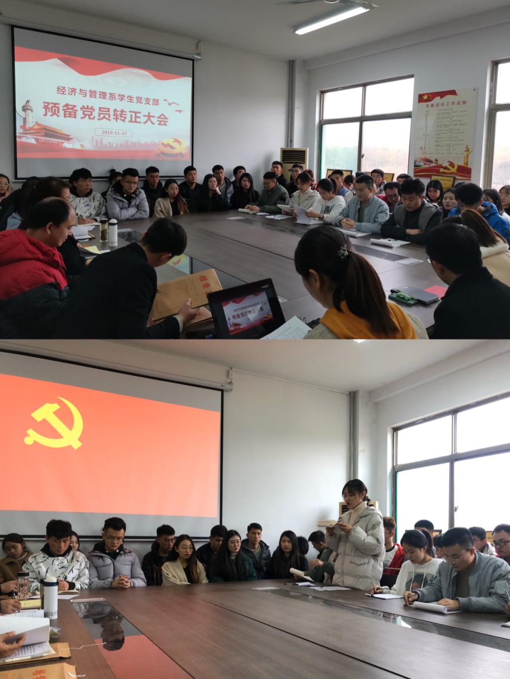 11月27日下午,经济与管理系(儒商学院)教工党支部和学生党支部分别在三楼会议室和党员活动室召开预备党员转正大会暨新发展预备党员入党宣誓大会。全体党员参加会议。