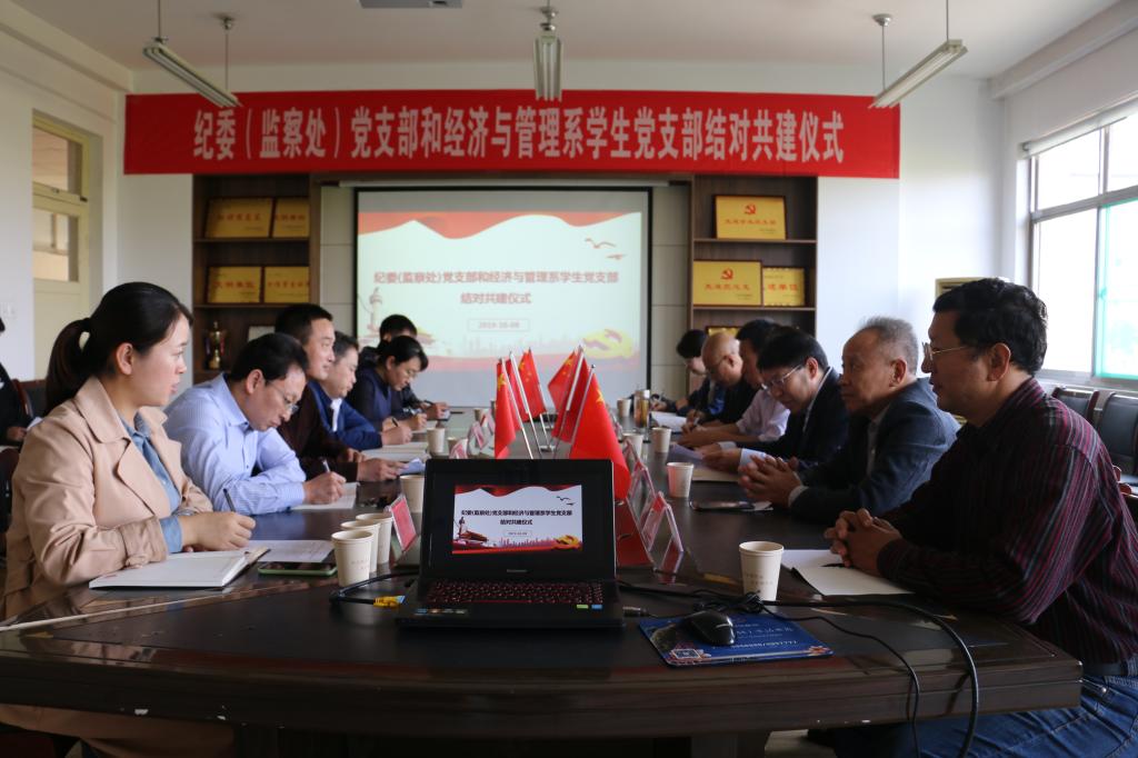 为深入推进 “不忘初心、牢记使命”主题教育,加强基层党组织建设,10月8日下午,纪委(监察处)党支部和经济与管理系学生党支部启动结对共建活动。纪委副书记、监察处处长吕祥华主持共建启动仪式,纪委副书记李传伟、党群部门总支书记郭怀伟、经济与管理系党总支书记陆波及党总支委员,以及双方支部党员参加活动。