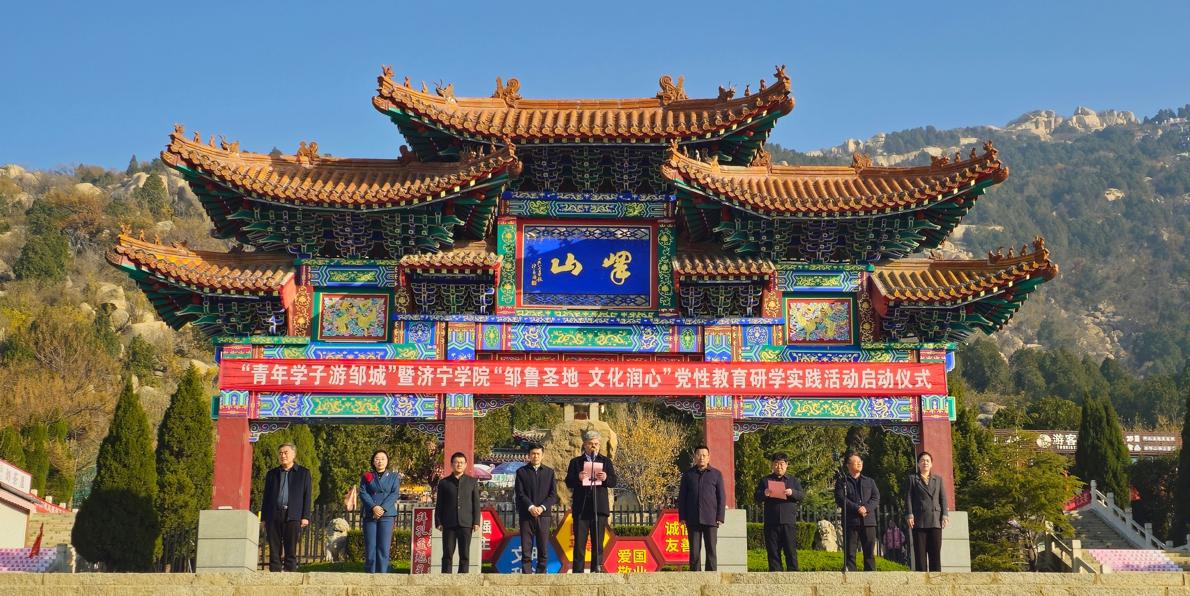 活动在峄山景区启动。乔东华在致辞中指出,本次活动是学院落实“立德树人”根本任务、深化党性教育实践的重要举措。通过走进邹鲁圣地,感悟孟子“浩然之气”“民本仁政”的思想精髓,引导师生党员在文化浸润中锤炼党性、砥砺初心,进一步增强“四个自信”,自觉肩负起时代赋予的使命担当。